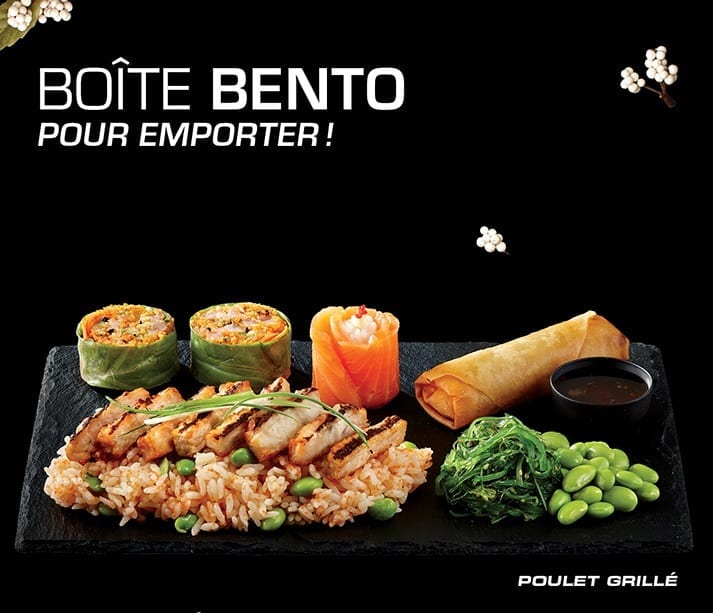 • Notre boîte Bento Poulet grillé contient de délicieuses lanières de poulet déposées sur un lit de riz mélangé avec des fèves edamame, du masago orange et de la sauce ponzu, une nouvelle recette de maki de tartare au crevette et un nouveau rouleau impérial
