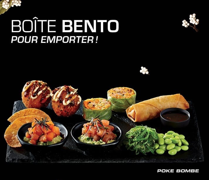 • Notre boîte Bento Poke bombe contient 2 bouchées de poke au saumon et au thon, une nouvelle recette de maki de tartare au crevette et un nouveau rouleau impérial