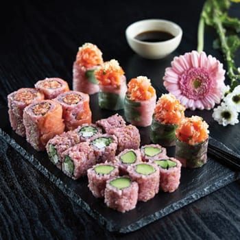 Un repas santé et coloré qui regroupe protéines de la mer (crevette), légumes (concombre), bon gras (avocat) sans oublier la touche qui rendent les sushis uniques (tempura, masago, mayo légère et sésame).