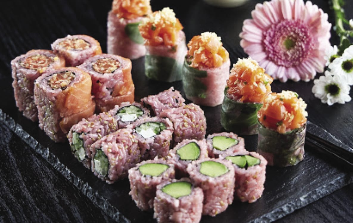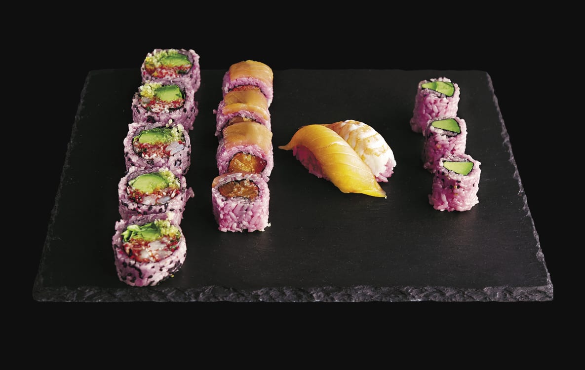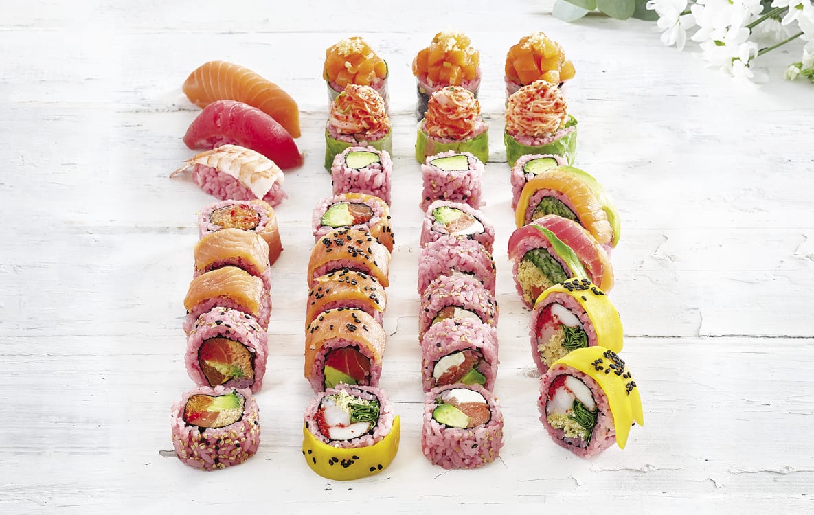 Rainbow Sumomaki: It’s hard to beat the bright hues of our Rainbow maki (add even more color with our pink rice)! And if you eat with your eyes first, we’re convinced that this salmon-tuna-avocado rainbow will also satisfy your tummy.